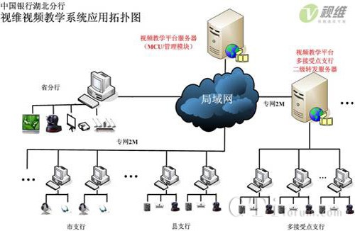 中國銀行湖北分行的視頻教學(xué)系統(tǒng)由服務(wù)器端和客戶端組成,服務(wù)器端軟件部署在省分行中心機房,配置2臺服務(wù)器,對于接受點超過5個的分支機構(gòu)配置二級轉(zhuǎn)發(fā)服務(wù)器,共支持全省各支行及支行內(nèi)多個客戶端同時在線,負責(zé)所有培訓(xùn)的召集、音視頻交互、加密等工作,各支行通過WEB方式即可實現(xiàn)客戶端軟件的自動安裝與升級,輕松實現(xiàn)實現(xiàn)省分行以及各支行共77余個接受點的高清音視頻視頻教學(xué)。同時為中國銀行湖北分行的視頻教學(xué)系統(tǒng)配置異構(gòu)兼容模塊,支持與其他視頻會議及軟、硬件視頻教學(xué)系統(tǒng)無縫融合,避免重復(fù)投資造成的浪費。網(wǎng)絡(luò)拓撲圖如下: