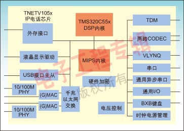 TI提供全面的VoIP解決方案,覆蓋IP電話、家庭網關、電信級網關以及VoADSL和VoCable。針對企業(yè)級IP電話需求,TI提供了多種解決方案,其中TNETV1050/TNEV1055的SoC方案基于TI的TMS320C55x DSP系列的可編程DSP和增強的32位MIPS內核。它使用先進的系統(tǒng)架構,在提供高性能低功耗的同時,兼顧系統(tǒng)的可擴展性,還包括豐富的外設接口,滿足設計企業(yè)級電話系統(tǒng)的要求。