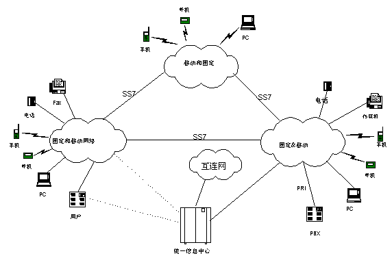 在圖中所示的組網(wǎng)圖中,包括了目前經(jīng)常使用的多種通訊方式。UMS統(tǒng)一信息系統(tǒng)在其中位于核心的位置。通過UMS,各種通訊方式具有了信息互通的轉(zhuǎn)發(fā)和接入點(diǎn),用戶可以通過任何一種通信方式接入到UMS中,從中提取或發(fā)送信息。