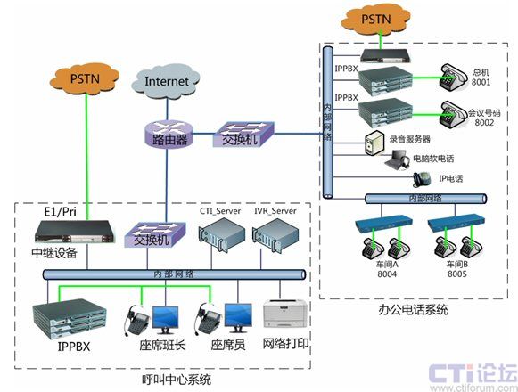 化。在總部核心機(jī)房將電話外線中繼接口與中繼網(wǎng)關(guān)設(shè)備連接,并通過(guò)內(nèi)部網(wǎng)絡(luò)對(duì)接到IPPBX,分別應(yīng)用于辦公電話系統(tǒng)和公司呼叫中心系統(tǒng)。設(shè)備用于公司辦公電話和公司會(huì)議系統(tǒng),可最大支持到30方會(huì)議,或多個(gè)小型獨(dú)立會(huì)議系統(tǒng)。各個(gè)不同的車(chē)間可以采用電話線之間接入分機(jī),或采用傲威AVG800的網(wǎng)關(guān)通過(guò)網(wǎng)絡(luò)接入,并注冊(cè)到IPPBX系統(tǒng)實(shí)現(xiàn)內(nèi)網(wǎng)網(wǎng)絡(luò)分機(jī)。對(duì)將來(lái)的分公司的辦公電話系統(tǒng),將不再使用傳統(tǒng)的PBX設(shè)備,而是直接利用IPPBX系統(tǒng),通過(guò)IP