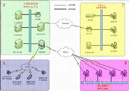 方案一:400電話+托管呼叫中心平臺+坐席分布在總部和分布點