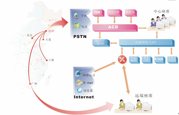 對(duì)于地區(qū)分布廣泛,而又要集中管理的企業(yè),可在各個(gè)局部地區(qū)設(shè)置遠(yuǎn)端座席,并通過(guò)網(wǎng)絡(luò)方便的接入中心系統(tǒng)。我們?yōu)檫h(yuǎn)端座席提供與中心座席完全相同的操作,遠(yuǎn)端座席可以根據(jù)各個(gè)地區(qū)的特定情況有針對(duì)性的處理各個(gè)局部地區(qū)的業(yè)務(wù),為中心分流壓力,同時(shí)中心系統(tǒng)也可以完全掌握遠(yuǎn)端座席的情況。我們可以非常明確的一點(diǎn)是:采用分布式座席的技術(shù),使得遠(yuǎn)端座席與中心座席除了地域上的差異,其它部分完全相同。可以說(shuō)只要網(wǎng)絡(luò)無(wú)極限,座席分布就是無(wú)極限的。