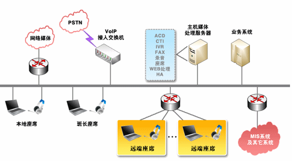 對于那些地區(qū)分布廣泛,而又要集中管理的單位,可在各個局部地區(qū)設置遠端座席,并通過網絡方便的接入中心系統(tǒng)。系統(tǒng)為遠端座席提供與中心座席完全相同的操作,遠端座席可以根據(jù)各個地區(qū)的特定情況有針對性的處理各個局部地區(qū)的業(yè)務,為中心分流壓力,同時中心系統(tǒng)也可以完全掌握遠端座席的情況。