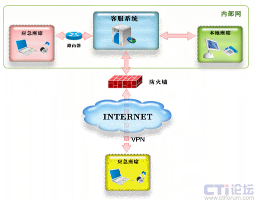 配置應(yīng)急座席的必要條件之一是網(wǎng)絡(luò)環(huán)境,要求應(yīng)急座席家庭計(jì)算機(jī)能夠連接到Internet或能夠直接訪問客服系統(tǒng)內(nèi)部網(wǎng)絡(luò),位于客服網(wǎng)絡(luò)防火墻之外需要通過(guò)相應(yīng)的技術(shù)連接到系統(tǒng),實(shí)現(xiàn)對(duì)系統(tǒng)的訪問。