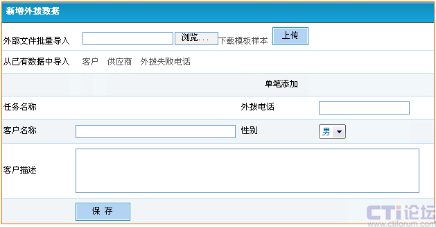 外撥數(shù)據(jù)管理:用來生成外撥所需要的電話號(hào)碼,可以從客戶資料庫、供應(yīng)商資料庫中調(diào)用,也可以手工填寫。同時(shí)支持外撥數(shù)據(jù)批量導(dǎo)入。