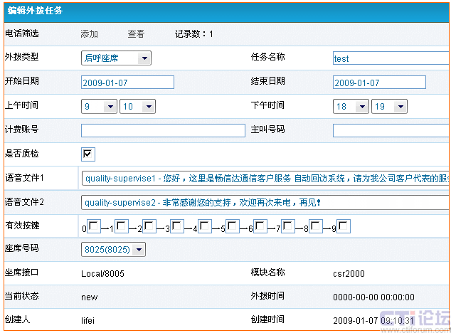 外撥任務(wù)管理:用來生成一個(gè)或多個(gè)外撥任務(wù)。添加外撥任務(wù)的流程是:1、選擇外撥數(shù)據(jù)中的號(hào)碼,2、選擇外撥類型(語音通知、自動(dòng)調(diào)查回訪、呼叫座席、接通指定應(yīng)用、執(zhí)行撥號(hào)腳本等),3、命名任務(wù)名稱,4、設(shè)定任務(wù)時(shí)間,5、根據(jù)不同的外撥類型設(shè)置外撥后的電話內(nèi)容,6、設(shè)定座席號(hào)碼(可設(shè)置一個(gè)或者多個(gè)座席)。