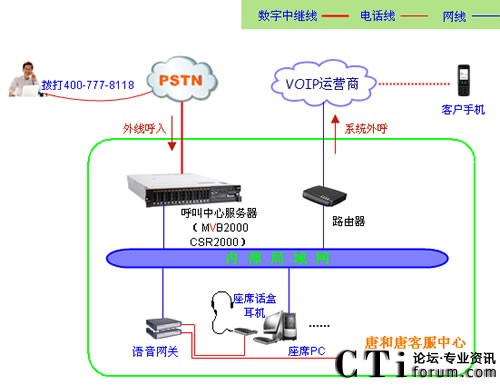唐和唐客戶服務(wù)中心系統(tǒng)由企業(yè)局域網(wǎng)、呼叫中心服務(wù)器(含MVB2000交換平臺、CSR2000座席系統(tǒng)、數(shù)字中繼接口板)、語音網(wǎng)關(guān)及座席話盒耳機和座席電腦組成的。呼入采用當(dāng)?shù)仉娦艛?shù)字中繼線路作為呼入線路;呼出采用VOIP運營商落地線路作為呼出線路。由呼叫中心系統(tǒng)自動完成呼入電話與呼出電話的路由,系統(tǒng)功能包括IVR語音導(dǎo)航、來電彈屏、客戶管理、通話錄音、CDR報表、自動外撥、點擊撥號等。