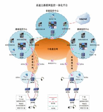 該系統(tǒng)集數(shù)字視頻傳輸、視頻管理、視頻存儲(chǔ)以及外網(wǎng)發(fā)布等功能為一體。 EV701中心設(shè)備有4個(gè)業(yè)務(wù)槽,可任意插拔編解碼卡,最多支持8路視音頻數(shù)據(jù)。采用H.264編碼標(biāo)準(zhǔn)的EV702外場(chǎng)綜合接入設(shè)備,將原來(lái)外場(chǎng)分散的攝像頭、快球、云臺(tái)、可變情報(bào)板、報(bào)警感應(yīng)器等設(shè)備融為一體,同時(shí)也支持MPEG編碼標(biāo)準(zhǔn)的視音頻接入?梢酝瑫r(shí)編碼2路以上的視音頻信號(hào),支持雙流傳輸,D1數(shù)據(jù)用于實(shí)時(shí)觀看,CIF數(shù)據(jù)用于存儲(chǔ)和Web網(wǎng)業(yè)務(wù)(包括對(duì)外發(fā)布實(shí)時(shí)圖像和管理人員異地監(jiān)控)。具備IP開(kāi)關(guān)斷功能,減輕了通信網(wǎng)絡(luò)的壓力。 路級(jí)中心、區(qū)域中心、省級(jí)中心分布式多級(jí)監(jiān)控,由省中心統(tǒng)一設(shè)定權(quán)限,進(jìn)行集中管理。