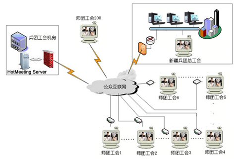 新疆建設(shè)兵團工會下設(shè)有14個師工會,111個團場工會.共有200個用戶同時參加視頻會議。中心服務(wù)器帶寬為100M光纖,各地終端通過網(wǎng)通2M寬帶接入,每個師、團級會場都有自己獨立的機房和會議室,適合進行基于IP網(wǎng)絡(luò)視訊會議的應(yīng)用,在這個網(wǎng)絡(luò)平臺上,優(yōu)視(URSACOM)HotMeeting富媒體視頻會議系統(tǒng)所提供的高質(zhì)量的視頻圖像和方便易用的文檔、文件共享功能,使得兵團工會領(lǐng)導(dǎo)能夠在這個平臺上進行從桌面討論到會議室正式會議等各種規(guī)模應(yīng)用。通過HotMeeting富媒體視頻會議系統(tǒng),除了進行全團工會系統(tǒng)例會,工作交流等常見的應(yīng)用之外,遠(yuǎn)程培訓(xùn)等也是經(jīng)常進行的內(nèi)容。各個師、團工會系統(tǒng)能利用數(shù)據(jù)功能和兵團總工會協(xié)調(diào)業(yè)務(wù),也能把平常培訓(xùn)的會議材料進行詳細(xì)介紹,節(jié)約了以前培訓(xùn)所花費的大量精力和時間。具體網(wǎng)絡(luò)拓?fù)湟娤聢D: