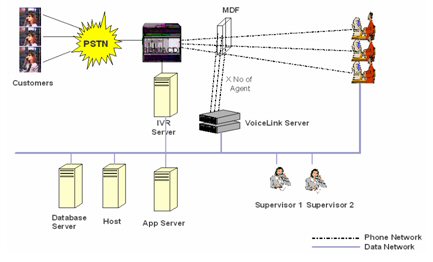 在Voicelink 電話網(wǎng)絡(luò)錄音方案下,語(yǔ)音可以通過(guò)每條的電話線獲得并能連接到Voicelink服務(wù)器上。語(yǔ)音將在Voicelink服務(wù)器里被處理,該服務(wù)器內(nèi)裝有語(yǔ)音卡。通過(guò)電話“摘機(jī)”和“掛機(jī)”的動(dòng)作來(lái)啟動(dòng)錄音和結(jié)束錄音。在TCP/IP的網(wǎng)絡(luò)下,主管可以調(diào)聽(tīng)錄音并通過(guò)登陸到服務(wù)器上進(jìn)行用戶(hù)管理。