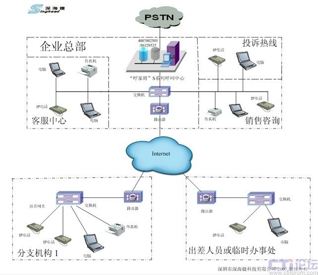 基于“呼家將”呼叫中心系統(tǒng)靈活的組網(wǎng)結(jié)構(gòu)以及強(qiáng)大的系統(tǒng)功能,其完全可以替代傳統(tǒng)的PBX系統(tǒng),洲際大酒店可以在公司總部建立中央呼叫中心系統(tǒng),其配置3條數(shù)字中繼線的接入能力,后續(xù)可以平滑擴(kuò)充成4條數(shù)字中繼線接入。內(nèi)線為300部座機(jī),全部使用模擬電話線和電話機(jī),并且可以繼續(xù)平滑擴(kuò)容,對(duì)于臨時(shí)辦公人員、出差人員以及外地辦事處,可以使用軟終端或者網(wǎng)關(guān)+普通電話的形式接入,其最大的優(yōu)勢(shì)是成本低,接入靈活。