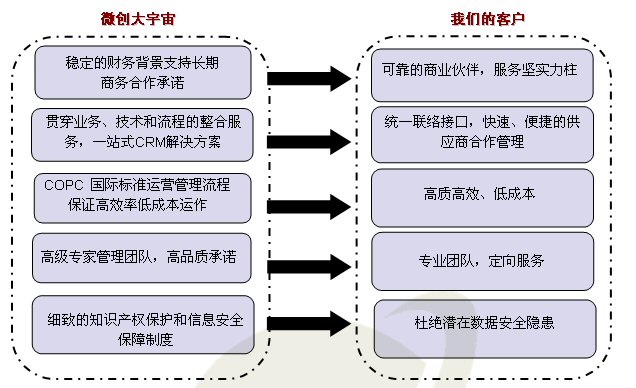 公司簡介 上海微創(chuàng)大宇宙信息技術(shù)有限公司是上海微創(chuàng)軟件有限公司與日本transcosmos集團公司于2006年2月28日強強聯(lián)手共同投資成立的專業(yè)CRM及呼叫中心外包服務(wù)商,專營包括產(chǎn)品技術(shù)支持、市場營銷服務(wù)、客戶關(guān)懷服務(wù)等一體化商業(yè)流程外包服務(wù),利用電話語音、電子郵件、傳真、短信、移動電話及網(wǎng)上聊天等多渠道支持包括普通話、廣東話、英語、漢語、日語、閩南語等多語種服務(wù),行業(yè)應(yīng)用遍及金融保險、IT通訊高科技術(shù)、快速消費、醫(yī)療器械、物流等多種領(lǐng)域,為遍及全球的客戶提供24*7的全天候服務(wù)。