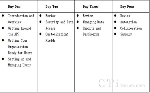 CRM 管理員是一個(gè)公司利用Salesforce CRM取得成功的關(guān)鍵。Administration Essentials培訓(xùn),您將會(huì)獲得工作中所需的核心知識(shí)。向?qū)<覍W(xué)習(xí),并獲得您所需要的技能,贏得獨(dú)家salesforce.com認(rèn)證。    馬上成為Salesforce.com認(rèn)證管理員!這種全面又易上手的課程是Salesforce CRM 管理員所必須的。 Administration Essentials培訓(xùn),確保您利用Salesforce獲得成功,我們建議管理員開(kāi)始Salesforce部署或接管現(xiàn)有的部署時(shí),先接受這門(mén)課程的培訓(xùn),F(xiàn)在參加報(bào)名培訓(xùn),還有ADM考試的報(bào)名優(yōu)惠券喲!