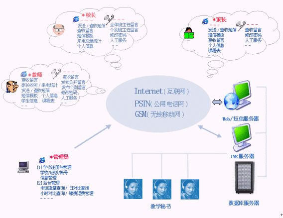 | 發(fā)送/查收短信< | 可以在INTERNET實時對本校所有班主任或個別班主任發(fā)送短信。也可接收其他人發(fā)送給自己的短信 |