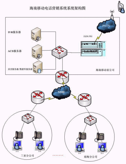 此次為電話營(yíng)銷系統(tǒng)一期工程,在省公司部署一套NBX V5000系統(tǒng)及相應(yīng)的CTI服務(wù)器,通過(guò)2條E1接入PSTN,在18個(gè)地市直接部署50個(gè)IP電話終端及坐席端軟件,語(yǔ)音走移動(dòng)已有的MDCN網(wǎng)絡(luò),一個(gè)集中受理分布處理的呼叫中心系統(tǒng)就建設(shè)起來(lái)啦,本次工程從設(shè)備到貨、系統(tǒng)上線試運(yùn)行,僅僅用了1個(gè)星期,我們海南移動(dòng)公司的項(xiàng)目經(jīng)理都驚訝的說(shuō)"太快啦啦,要是使用傳統(tǒng)的排隊(duì)機(jī)部署一個(gè)分布全省的類似系統(tǒng),少說(shuō)工期也得幾個(gè)月"。經(jīng)過(guò)1個(gè)月的試運(yùn)行,系統(tǒng)運(yùn)行穩(wěn)定,各項(xiàng)系統(tǒng)指標(biāo)滿足合同要求,在11月份系統(tǒng)順利通過(guò)初驗(yàn)。
