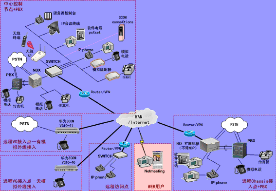 ③.遠程接入的辦公室不再需要專用的 PBX, 只需要將3Com NBX電話終端接入到WAN網中,就能地實現(xiàn)在WAN或Internet上與3Com
