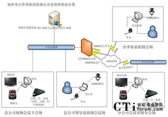 瑞和項(xiàng)目管理集團(tuán)網(wǎng)絡(luò)基礎(chǔ)建設(shè)以后,各個分支機(jī)構(gòu)通過ADSL接入到互聯(lián)網(wǎng),一般每個分支單位大約5人左右,負(fù)責(zé)1個省的業(yè)務(wù)。在現(xiàn)有的網(wǎng)絡(luò)基礎(chǔ)上構(gòu)建了XView迅流視頻系統(tǒng),來滿足各地之間的溝通需求,系統(tǒng)的大范圍使用大大的提高辦公效率,節(jié)省時(shí)間及會議成本。隨著各部門遠(yuǎn)程通信需求日益增多,充分發(fā)揮現(xiàn)有網(wǎng)絡(luò)優(yōu)勢,根據(jù)瑞和項(xiàng)目管理集團(tuán)實(shí)際規(guī)模,對XView迅流視頻會議系統(tǒng)進(jìn)行擴(kuò)容到全國50個重點(diǎn)分支,改造以后XView迅流視頻會議系統(tǒng)作為公司主要通訊手段。實(shí)現(xiàn)各個分公司、辦事處充分應(yīng)用網(wǎng)絡(luò)視頻會議系統(tǒng)進(jìn)行音頻、視頻和數(shù)據(jù)的多方溝通,提高辦公效率。