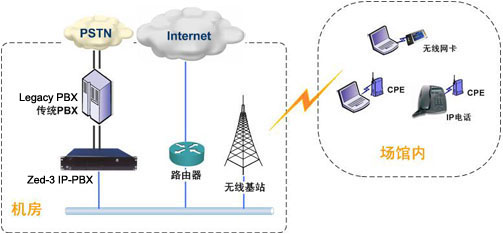 使用無線基站作為網(wǎng)絡(luò)傳輸通道,配合無線網(wǎng)卡,無線CPE終端和IP話機(jī),提供數(shù)據(jù)和語音的終端服務(wù)。   這樣就能簡單方便的給場館內(nèi)的人員提供即插即用的數(shù)據(jù)和語音業(yè)務(wù)。