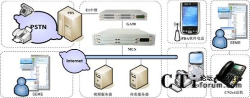 4)該系統(tǒng)支持多類終端,辦公人員不僅可以通過登陸SEME辦公軟件在線辦公,還可以配備臺式CN2x4VOIP電話、在PC上安裝SP3軟件電話及使用帶有WIFI功能的手機進行VOIP免費通話。