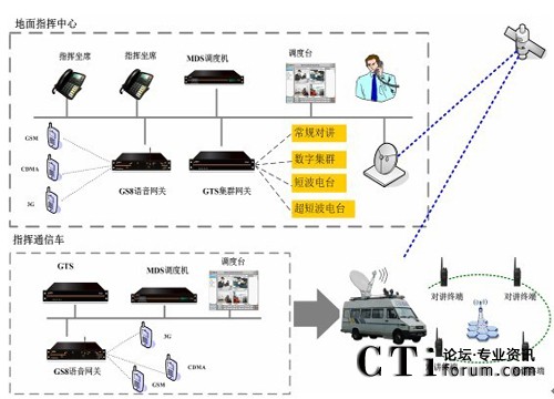 整體系統(tǒng)由地面指揮中心和指揮通信車組成,指揮中心和通信車分別部署調(diào)度臺,均可指揮現(xiàn)場。地面指揮中心和指揮通信車通過部署衛(wèi)星設(shè)備,通過衛(wèi)星鏈路進行通信,當(dāng)衛(wèi)星鏈路出現(xiàn)故障時,指揮車也可通過移動網(wǎng)絡(luò)(GSM/CDMA/3G)與地面指揮中心互聯(lián)互通。