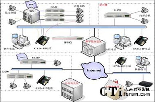 由于總部的網(wǎng)絡(luò)帶寬充足,因此部署了一臺(tái)核心IP PBX服務(wù)器——MCS1000。負(fù)責(zé)處理來(lái)自GA90、CN2x4、以及軟件電話的語(yǔ)音業(yè)務(wù)并給該系統(tǒng)配置一個(gè)公網(wǎng)的IP地址,適合于移動(dòng)辦公的公網(wǎng)用戶,及沒(méi)有實(shí)現(xiàn)VPN的辦事處的接入,直接通過(guò)公網(wǎng)注冊(cè)到該核心系統(tǒng)上來(lái),然后通過(guò)相關(guān)的配置,統(tǒng)一管理下屬的語(yǔ)音終端設(shè)備。
