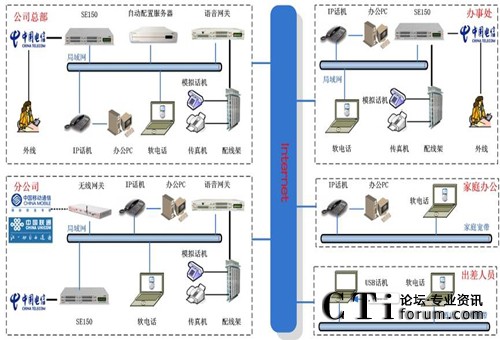 - 分布式部署:總部和各分支機(jī)構(gòu)的分機(jī),是通過(guò)IP網(wǎng)絡(luò)融合在一個(gè)語(yǔ)音平臺(tái)上來(lái)實(shí)現(xiàn)內(nèi)部通信。總部和辦事處分機(jī)、家庭辦公分機(jī)、出差人員的軟電話均注冊(cè)在總部的SE150上,各分公司的分機(jī)注冊(cè)在本地的SE150上,由本地的SE150管理。