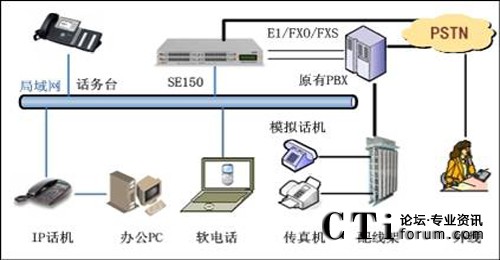 此方案適用于已經(jīng)部署了傳統(tǒng)PBX的企業(yè)。要求企業(yè)部署好數(shù)據(jù)網(wǎng)絡(luò),如果采用模擬終端,則企業(yè)的各個(gè)辦公點(diǎn)需要先將網(wǎng)絡(luò)線路和電話線路部署到位,同時(shí)企業(yè)原有的PBX要預(yù)留與SE150對(duì)接的接口。