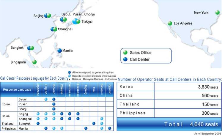 transcosmos于1989年在美國建立了海外分部并于2001年開始進(jìn)軍亞洲的海外市場提供呼叫中心和數(shù)碼營銷服務(wù)。Transcosmos在呼叫中心服務(wù)上共投資450,000,000日元而且在6個國家的10所城市發(fā)展了本地的呼叫中心服務(wù)。同時,transcosmos為了滿足客戶促進(jìn)業(yè)務(wù)發(fā)展的需求,在亞洲各國戰(zhàn)略性地設(shè)置了執(zhí)行官以及總監(jiān)級別的管理層,也建立了可以提供10種主要亞洲語言的構(gòu)架。通過transcosmos多樣分部的統(tǒng)一管理,提高了服務(wù)質(zhì)量并且在不斷累積的業(yè)務(wù)訣竅和知識上達(dá)到業(yè)務(wù)效能。