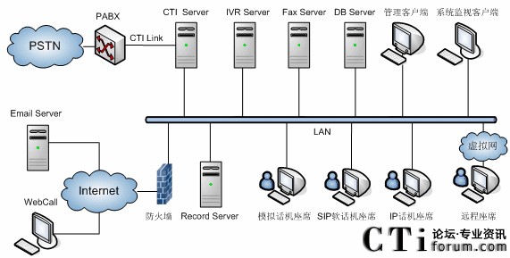 | 7 | 座席 | 也稱(chēng)為業(yè)務(wù)代表,其基本配置為一臺(tái)PC和一個(gè)帶耳機(jī)和話(huà)筒的電話(huà)機(jī),完成用戶(hù)呼入的人工受理。它和排隊(duì)機(jī)ACD相連,同時(shí)接受CTI服務(wù)器的控制。在電話(huà)進(jìn)入后的任何過(guò)程中均可以實(shí)現(xiàn)自動(dòng)流程處理與人工座席處理的靈活切換。在自動(dòng)應(yīng)答系統(tǒng)不能回答用戶(hù)問(wèn)題時(shí),能夠在呼叫用戶(hù)的控制下進(jìn)入到人工應(yīng)答系統(tǒng);在不再需要人工應(yīng)答時(shí),可切換到自動(dòng)應(yīng)答系統(tǒng)回答用戶(hù)的問(wèn)題。