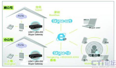 本公司新推出USKY UBS-400(4 ports)/UBS-200(2 ports) Skype Gateway,是專為企業(yè)用戶所設計的外接式Skype網(wǎng)關。只須將原有電話交換機(PBX)連接上我們的USKY UBS-400/UBS-200,企業(yè)用戶無需改變撥號方式,便可輕松透過桌上電話撥打或接聽Skype電話,將傳統(tǒng)電話提升為網(wǎng)絡電話(VoIP),既簡單又方便!有效幫助企業(yè)用戶增加通話效率,更能大幅減少通話費。