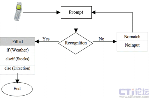 VoiceXML解釋器組件( VoiceXML Browser)解釋和執(zhí)行VoiceXML腳本語言并把結(jié)果轉(zhuǎn)換成語音傳送給用戶(圖中的步驟4)。在執(zhí)行過程中,用戶可能需要通過語音和VoiceXML服務(wù)器進(jìn)行交互,比如菜單選擇或者對查詢結(jié)果進(jìn)行過濾等。VoiceXML服務(wù)器通過呼叫控制組件(CCXML