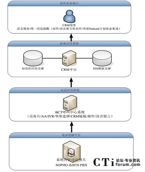 原先電話系統(tǒng)與CRM系統(tǒng)是獨(dú)立的兩個系統(tǒng),客服人員面對大量的客戶,迅速的獲悉來電客戶的身份、背景資料以及歷史資料在很大程度上決定了其服務(wù)質(zhì)量。BCT呼叫中心系統(tǒng)位于PBX與CRM之間,作為一個中間的橋梁,對PBX送來的電話信息或者用戶輸入的卡號等數(shù)據(jù)進(jìn)行處理分析,對主叫號碼或用戶輸入卡號進(jìn)行識別后,傳遞給CRM;CRM檢索與其相連的HIS(醫(yī)院信息系統(tǒng))的數(shù)據(jù)庫,將客戶資料以及相關(guān)的歷史記錄通過彈出網(wǎng)頁的模式,同步的顯示在坐席的計算機(jī)上,方便客服代表的輸入和后續(xù)操作,提高了效率與正確率。同時,客戶代表還可以在CRM頁面中點(diǎn)擊電話號碼,通過BCT發(fā)起電話呼叫來聯(lián)系客戶,來處理用戶回訪等工作。