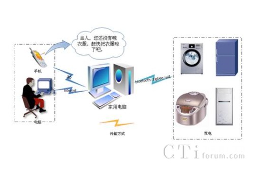 家電遠(yuǎn)控系統(tǒng)的原理是利用電腦或者手機(jī)的電源管理系統(tǒng),來管理用戶終端軟件管理電源的開關(guān)、定時(shí)、預(yù)設(shè)時(shí)間等,利用互聯(lián)網(wǎng)或者手機(jī)網(wǎng)絡(luò)把信號(hào)傳輸?shù)郊彝ル娔X,家庭電腦當(dāng)作小型服務(wù)器或者信號(hào)轉(zhuǎn)發(fā)點(diǎn),把信號(hào)利用藍(lán)牙、zigbee、wifi等無線傳輸?shù)街付ǖ碾娫床遄?dāng)然每個(gè)電源插座都要有相應(yīng)的信號(hào)接收模塊實(shí)現(xiàn)和家庭電腦的信號(hào)傳輸,實(shí)現(xiàn)了對(duì)電源的管理功能。家電遠(yuǎn)控終端軟件嵌入語(yǔ)音合成軟件,利用合成語(yǔ)音報(bào)讀預(yù)設(shè)的提醒內(nèi)容和時(shí)間提醒,具有危急情況下的報(bào)警功能。當(dāng)然如果我們是在家里,可以直接用手機(jī)通過藍(lán)牙對(duì)電源插座進(jìn)行管理,或者通過家庭電腦進(jìn)行管理。如圖所示: