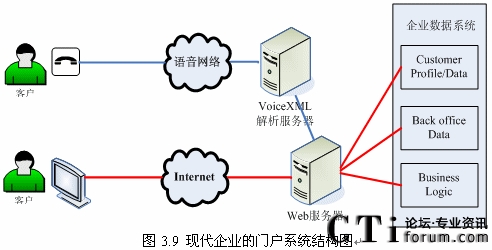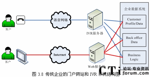 隨著Internet和Web技術(shù)的迅速發(fā)展,越來的企業(yè)開始建立自己的門戶網(wǎng)站,同時(shí)又擁有自己的IVR系統(tǒng)(如圖3.8所示),但是兩套系統(tǒng)完全獨(dú)立,語(yǔ)音系統(tǒng)和數(shù)據(jù)系統(tǒng)沒有任何交互或者只有很少的交互。而建立IVR系統(tǒng)的目標(biāo)就是給客戶更好的體驗(yàn),使客戶能方便的通過電話完成更多以前需要登陸企業(yè)門戶網(wǎng)站,或者親自去企業(yè)或其網(wǎng)點(diǎn)去辦理的業(yè)務(wù),這就需要IVR系統(tǒng)能跟后臺(tái)數(shù)據(jù)系統(tǒng)有更多更好的交互!罢Z(yǔ)音門戶”的概念出現(xiàn)也愈發(fā)的證明這一點(diǎn)。