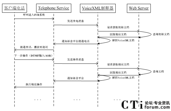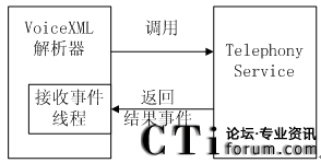 當(dāng)VoiceXML解析器做完解析工作之后,遇到需要語(yǔ)音操作時(shí),就得依靠調(diào)用Telephoney API來完成,同時(shí)Telephony Service需要向VoiceXML解析器去返回相應(yīng)的語(yǔ)音操作結(jié)果事件。圖3.15描述了這一過程。