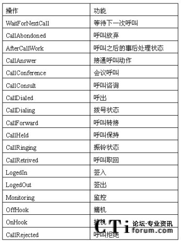 在呼叫中心服務(wù)器發(fā)送事件時(shí),它都會(huì)對(duì)事件的對(duì)象指定的一個(gè)狀態(tài)。在任何時(shí)間,ODS源數(shù)據(jù)庫中,每個(gè)對(duì)象都被指定成一個(gè)唯一的狀態(tài)。這些狀態(tài)都來自話務(wù)對(duì)象的操作。