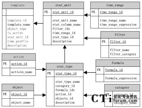 在模板配置存儲(chǔ)模型圖中,分別建立了單獨(dú)的表對(duì)模板劃分的每一個(gè)基本對(duì)象進(jìn)行儲(chǔ)存。表template存儲(chǔ)模板的配置信息,stat_unit表存儲(chǔ)了統(tǒng)計(jì)項(xiàng)的基本信息,stat_type表是一些有關(guān)模板具體內(nèi)容的配置。各表之間通過各自的ID標(biāo)識(shí)號(hào)來進(jìn)行關(guān)聯(lián)。不過一個(gè)模板可以包括多個(gè)統(tǒng)計(jì)單元,一個(gè)統(tǒng)計(jì)項(xiàng)可以包含多個(gè)過濾項(xiàng),一個(gè)統(tǒng)計(jì)內(nèi)容可以包含多個(gè)公式,這樣他們之間的ID關(guān)聯(lián)就成為1對(duì)多的關(guān)系。在這種情況下,父項(xiàng)中的ID關(guān)聯(lián)多個(gè)子項(xiàng)ID,其間是用逗號(hào)分隔。