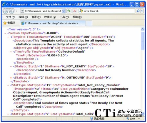 在模板導(dǎo)出的XML儲(chǔ)存圖中,ReportVersion屬性為報(bào)表系統(tǒng)的版本號(hào)。Template信息用來指定一個(gè)模板名字,給模板一個(gè)唯一的模板ID,再指定該模板是否激活,另外也為該模板添加了注釋。該例中是對(duì)所有坐席活動(dòng)的數(shù)據(jù)進(jìn)行統(tǒng)計(jì)。ObjectType為模板的統(tǒng)計(jì)類型,該模板中統(tǒng)計(jì)類型為坐席(Agent)。TimeProfile為設(shè)定收集的時(shí)間間隔,本例中為從每天的0點(diǎn)0分開始,每隔15分鐘收集一次。Statistic對(duì)應(yīng)了一個(gè)統(tǒng)計(jì)內(nèi)容配置,根據(jù)StatTypeID在下面將列出詳細(xì)內(nèi)容。本例中StatTypeID為19,下面的StatType中將會(huì)根據(jù)StatTypeID與之相對(duì)應(yīng),其中配置了Category,