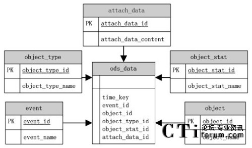 根據(jù)ODS源數(shù)據(jù)庫模型圖,ods_data表中存儲(chǔ)了事件發(fā)送的時(shí)間(time_key)、事件(event)、報(bào)表統(tǒng)計(jì)對(duì)象(object)、對(duì)象狀態(tài)(object_stat)、對(duì)象類型(object_type)以及一些隨路數(shù)據(jù)(attach_data)等信息。這些對(duì)象的詳細(xì)信息都是以各部分的ID來對(duì)內(nèi)容進(jìn)行關(guān)聯(lián)。