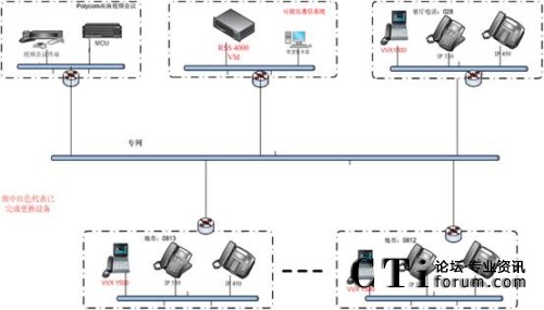 通過(guò)網(wǎng)絡(luò)還可以將系統(tǒng)與現(xiàn)有高清視頻會(huì)議系統(tǒng)進(jìn)行連接,在VVX1500話機(jī)之間實(shí)現(xiàn)單點(diǎn)視頻通信的基礎(chǔ)上,實(shí)現(xiàn)VVX1500的多點(diǎn)通訊以及和視頻會(huì)議終端之間的點(diǎn)對(duì)點(diǎn)視頻通信。同時(shí),領(lǐng)導(dǎo)也可以通過(guò)MCU加入到視頻會(huì)議中實(shí)現(xiàn)多方視頻會(huì)議,這樣就可以實(shí)現(xiàn)領(lǐng)導(dǎo)在辦公室參加視頻會(huì)議,而不用每次去會(huì)議室開(kāi)會(huì)。