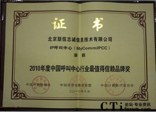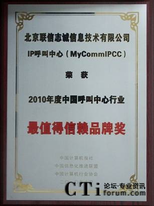 CTI論壇(ctiforum)11月1日消息(記者 潘婷婷):近日,在國家信息化專家咨詢委員會的指導下,作為中國信息化發(fā)展重要推動力量的中國計算機報社、中國計算機行業(yè)協(xié)會、中國信息化推進聯盟等國家級權威媒體及國家信息化領域一級權威機構,共同組織開展“2010中國行業(yè)信息化讀者選擇獎評選”,重點展示信息化在行業(yè)應用中的優(yōu)秀應用案例、產品及解決方案。由中國計算機報社組織業(yè)內專家,在經過歷時3個月的產品征集、方案論證、專家評審后,北京聯信志誠信息技術有限公司(簡稱MyComm公司),其核心產品MyCommIPCC獨占2010年中國呼叫中心行業(yè)最值得信賴品牌獎。
