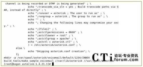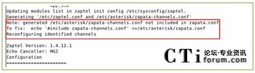 下圖為運行上述命令的輸出,從輸出我們可以發(fā)現(xiàn)一個問題,(使用本文的所用的軟件版本可能會出現(xiàn)的一個問題,其他的版本不一定會出現(xiàn)),/etc/asterisk/zapata-channels.conf