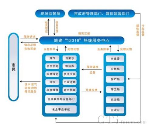 3. 各城管系統(tǒng)都設立專門機構直接與熱線中心聯(lián)系,即時處理服務中心轉(zhuǎn)來的各類問題,實現(xiàn)“市民→熱線中心→責任單位→市民”的閉路循環(huán),做到受理及時、反應快速、處理到位, 使 12319 熱線成為密切政府與群眾關系、 創(chuàng)建行業(yè)服務品牌的一項重要舉措。