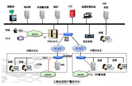 中心點(diǎn)和分支點(diǎn)的客服系統(tǒng)通過兩地的語音網(wǎng)關(guān)進(jìn)行語音連接,具體實(shí)現(xiàn)大概是,如果分支點(diǎn)需要把語音轉(zhuǎn)接到中心點(diǎn),分支點(diǎn)把TDM語音轉(zhuǎn)接到語音網(wǎng)關(guān),語音網(wǎng)關(guān)把TDM語音信號(hào)轉(zhuǎn)變?yōu)镮P包,通過網(wǎng)絡(luò)發(fā)送到中心點(diǎn)的語音網(wǎng)關(guān)上,語音網(wǎng)關(guān)把IP包變?yōu)門DM語音信號(hào),在接入到交換機(jī)上,由中心點(diǎn)CTI按照指定的策略轉(zhuǎn)接到最終目標(biāo)上。