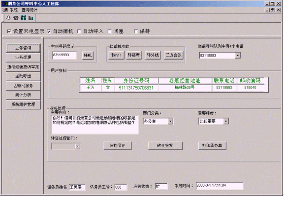客戶(hù)打入電話(huà)后,當(dāng)系統(tǒng)的自動(dòng)語(yǔ)音應(yīng)答子系統(tǒng)無(wú)法解決客戶(hù)問(wèn)題時(shí),客戶(hù)可選擇人工服務(wù),由企業(yè)客戶(hù)服務(wù)代表直接接聽(tīng)客戶(hù)電話(huà),處理并解決客戶(hù)問(wèn)題。此時(shí)客戶(hù)同座席話(huà)務(wù)人員直接溝通,并同時(shí)記錄下該客戶(hù)的聯(lián)系方式,將相關(guān)數(shù)據(jù)添加入系統(tǒng)數(shù)據(jù)庫(kù);也可以在數(shù)據(jù)庫(kù)的支持下回答接受查詢(xún)卷煙/價(jià)格/限額/新品種、卷煙經(jīng)營(yíng)規(guī)范制度/卷煙專(zhuān)賣(mài)政策法規(guī)咨詢(xún)、通報(bào)最近暢銷(xiāo)卷煙的限額情況/通報(bào)最近增加的新品種/煙草公司召集的活動(dòng)通知、投訴和舉報(bào)違法經(jīng)銷(xiāo)行為、卷煙預(yù)訂、電話(huà)訪銷(xiāo)、滿(mǎn)意度調(diào)查等。
