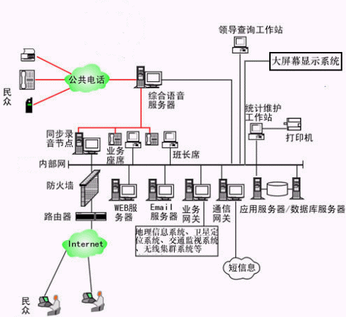 本系統(tǒng)物理結(jié)構(gòu)由語(yǔ)音交換機(jī)、座席分流器、呼叫管理服務(wù)器(CTI服務(wù)器)、IVR(交互式語(yǔ)音應(yīng)答)/IFR(交互式傳真應(yīng)答、業(yè)務(wù)代表座席、調(diào)度席、統(tǒng)計(jì)維護(hù)管理工作站、數(shù)據(jù)庫(kù)/應(yīng)用服務(wù)器、通信網(wǎng)關(guān)服務(wù)器、業(yè)務(wù)網(wǎng)關(guān)服務(wù)器、錄音工作站、領(lǐng)導(dǎo)查詢(xún)工作站、大屏幕顯示系統(tǒng)、網(wǎng)絡(luò)系統(tǒng)等構(gòu)成。
