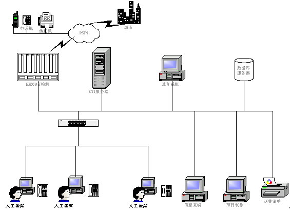 1) 數(shù)據(jù)庫系統(tǒng): 存放各類待查信息數(shù)據(jù)、話務(wù)統(tǒng)計數(shù)據(jù)、話務(wù)員操作明細數(shù)據(jù)等;