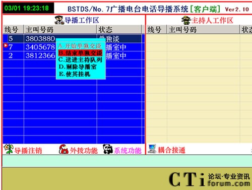 如想接聽哪個電話號碼,用右鍵點擊這個號碼會出現(xiàn)菜單,在菜單中只有三種命令可以選擇“單獨交談”“剔除導播室”“使其掛機”。點擊“開始單獨交談”后拿起電話聽筒,這時導播可以單獨同參與者通話了,其他參與者聽不到交談,只能聽到音樂聲,導播問明參與者參與內容后須接入直播間的,應按“結束單獨交談”后點擊“送到主持列隊”送到主持人區(qū)等待主持人同參與者交談。