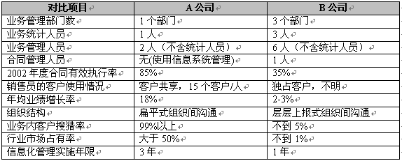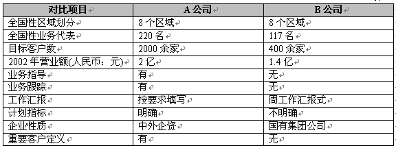 在最近一次對照了兩家同具有全國性區(qū)域推廣業(yè)務(wù)的公司之后,我們發(fā)現(xiàn),精細(xì)營銷為企業(yè)帶來的效益是顯著的。我們以A公司表示采用了精細(xì)營銷,B公司未采用精細(xì)營銷,表1反映兩家公司的主要數(shù)據(jù)對照: