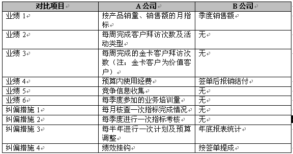 顯然,兩家公司在經(jīng)營業(yè)績和人員規(guī)模上有差不多的基礎(chǔ),但兩家所處的行業(yè)和性質(zhì)有明顯不同,如何評估兩家企業(yè)精細(xì)營銷的管理效益呢?我們再以表2反映兩家公司對業(yè)務(wù)代表工作指標(biāo)及糾偏: